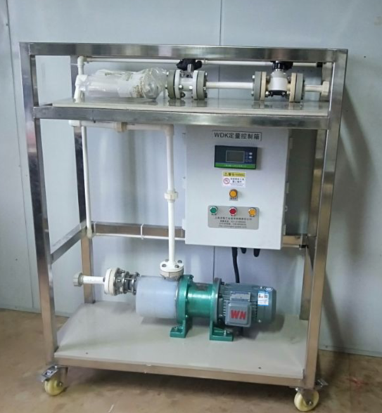 WDK氯化鈉配發料定量控制箱在單泵定量控制系統移動小車上的安裝使用的實物圖如下: